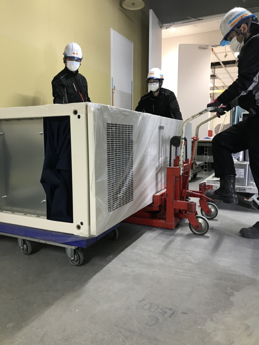 天板が外すことができる商品だったので、上部からつり下ろして設置しました。また、トランスがキュービクル内に接触しないように現場スタッフ同士声掛けし合い、事故なく無事に作業完了致しました。